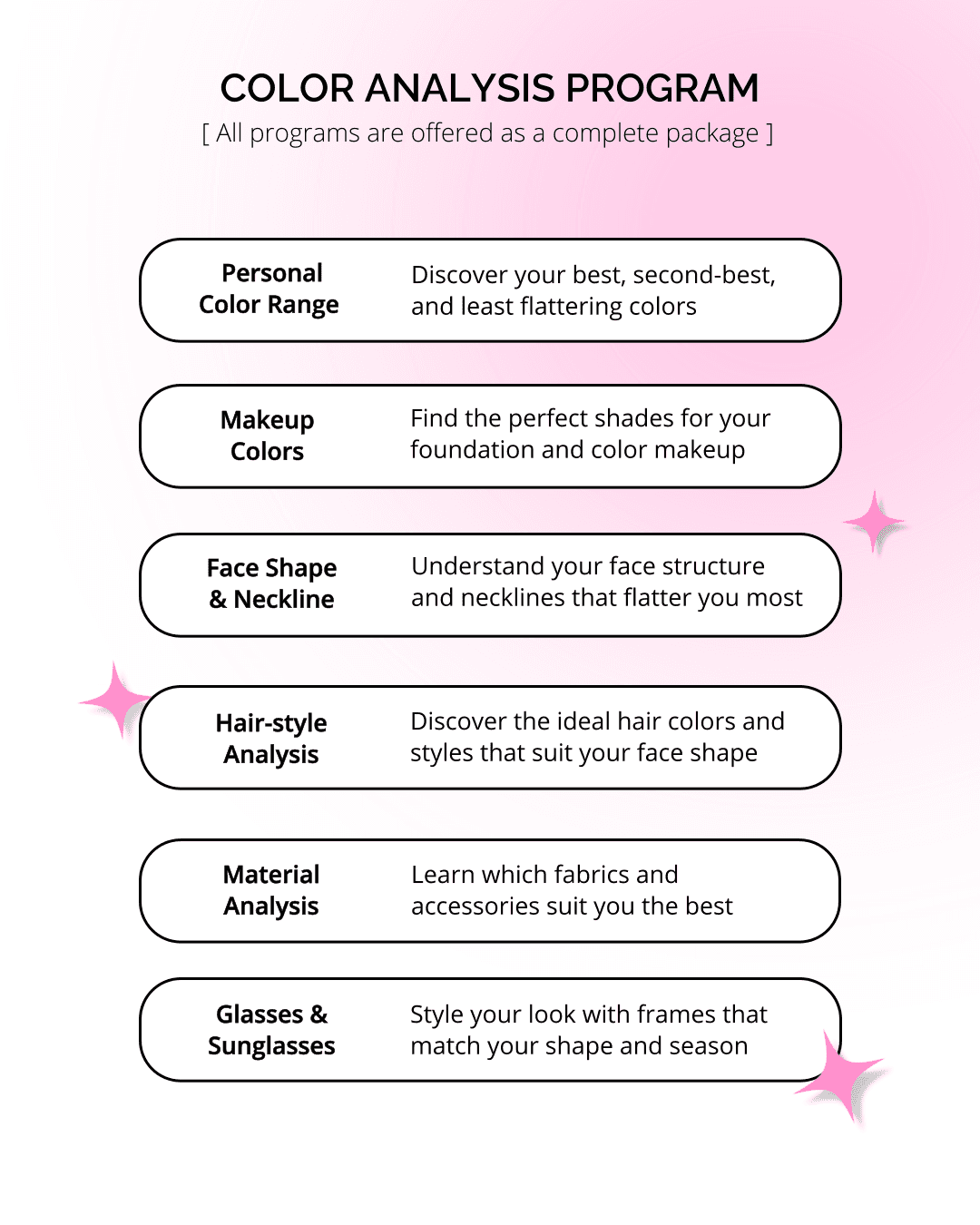 Color Analysis sessions for individuals, pairs, and small groups